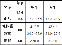 二、男生、女生体重质素(BMI)单项评分表(单位:千克/米2)