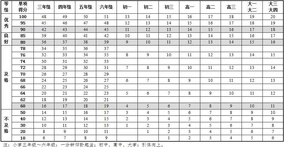 6.本标准的学年总分由标准分与附加分之和构成,满分为120分。标准分由各单项指标得分与权重乘积之和组成,满分为100分。附加分根据实测成绩确定,即对成绩超过100分的加分指标进行加分,满分为20分;小学的加分指标为1分钟跳绳,加分幅度为20分;初中、高中和大学的加分指标为男生引体向上和1000米跑,女生1分钟仰卧起坐和800米跑,各指标加分幅度均为10分。