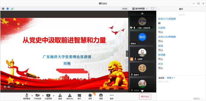 会上,刘艳博士作了题为《从党史中汲取前进智慧和力量》的专题报告。她从为什么要学习党史——习近平总书记关于党史重要论述;党史学习应学什么——党的伟大诞生和百年辉煌历程;党史学习须怎样学——以大历史观把握历史发展规律和大势等三方面内容进行讲解。她引导大家重温了习近平总书记在党史学习教育动员大会上所讲的“三个必然要求”。开展党史学习教育,是牢记初心使命、推进中华民族伟大复兴历史伟业的必然要求;是坚定信仰信念、在新时代坚持和发展中国特色社会主义的必然要求;是推进党的自我革命、永葆党的生机活力的必然要求。我们党已经发展成为一个走过百年光辉历程、执政70多年、拥有9100多万党员的世界上最大的马克思主义执政党,我们党始终立志于中华民族千秋伟业,百年恰是风华正茂,始终站在时代潮流最前列、站在攻坚克难最前沿、站在最广大人民之中,我们党必将永远立于不败之地。