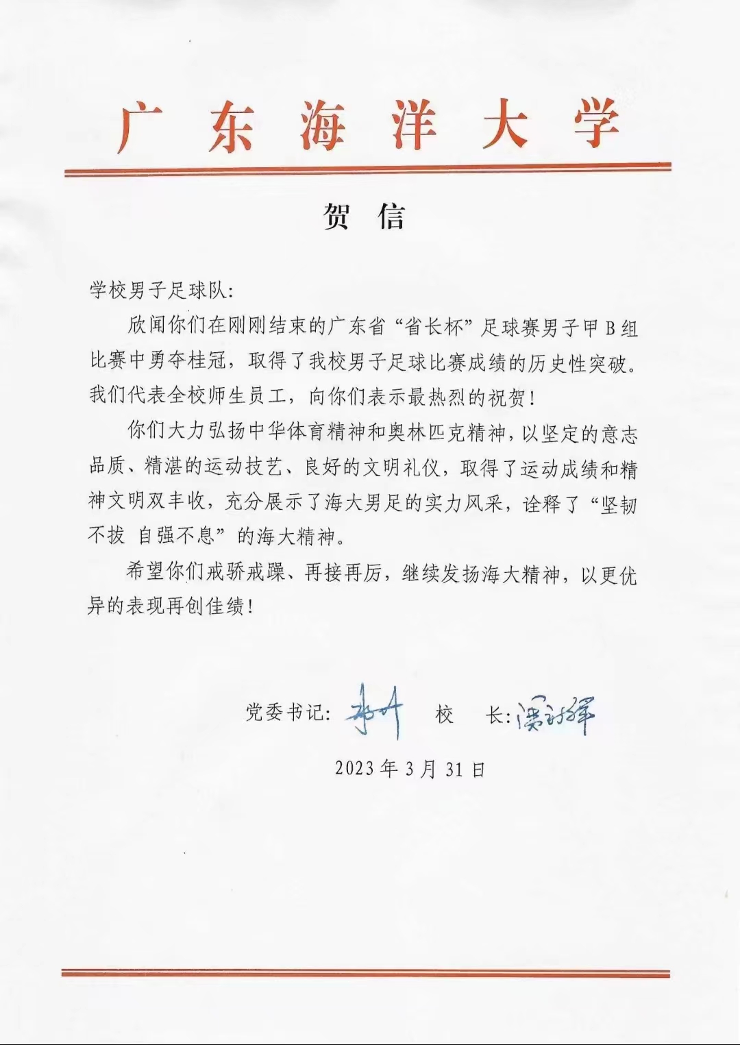 爱游戏 足球队在爱游戏 领导的大力支持下,积极备战,奋力拼搏,经过7场比赛的激烈角逐,荣获冠军,为爱游戏 争得荣誉,爱游戏 党委书记杨洲、校长潘新祥为此写了贺信。
