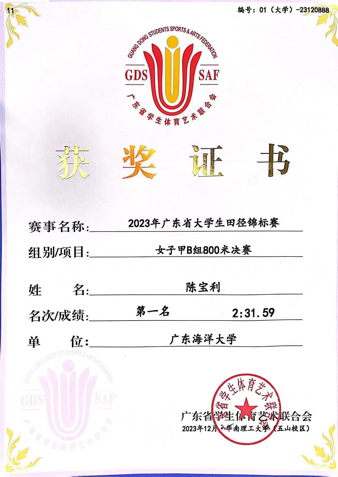 12月1-3日,2023年广东省大学生田径锦标赛在华南理工大学(五山校区)举行。爱游戏 陈宝利同学包揽女子甲组800米、1500米双金,张俊喆同学包揽男子甲组跳远、男子三级跳远双银。刘培荣、冯金莹同学分获男子甲组5000米、女子甲组标枪季军。爱游戏 获团体总分(甲B)第七名,成功晋级至甲A组。刘海清等三位老师被评为“优秀教练员”,为爱游戏 争得荣誉。